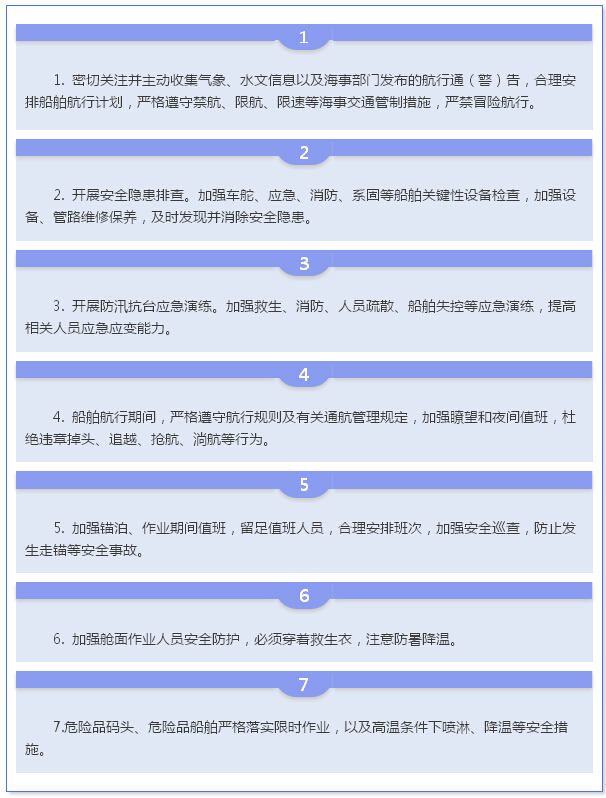 為有效應(yīng)對極端防汛期對船舶航行安全的不利影響,保障船上人命和財產(chǎn)安全,特此提醒船員朋友們做好以下安全防范工作: