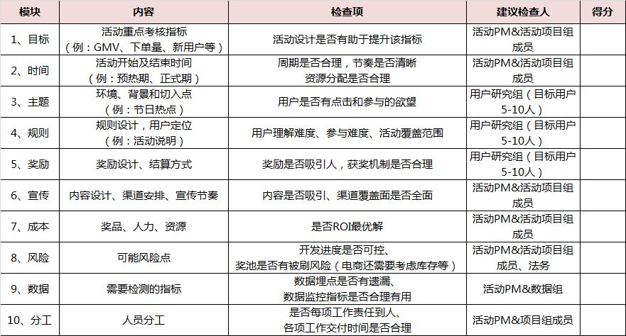 每個模塊得分為10分,滿分為100分,單項(xiàng)得分低于6分的模塊,均需要重新評估優(yōu)化,得分高于70分的活動才可以進(jìn)入落地執(zhí)行的環(huán)節(jié)。