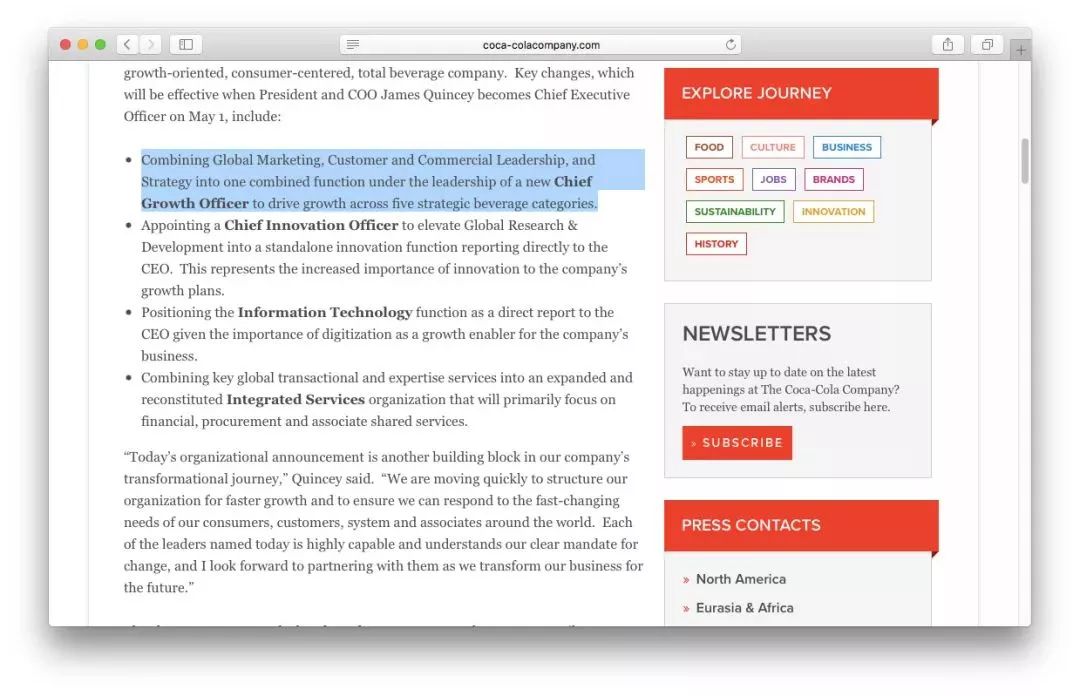 楊:2017 年 3 月,可口可樂宣布取消設(shè)立24年之久的 CMO 一職,取而代之的是一個(gè)新角色——首席增長(zhǎng)官(ChiefGrowthOfficer)??煽诳蓸返恼w戰(zhàn)略也向「以增長(zhǎng)為導(dǎo)向,以消費(fèi)者為中心」持續(xù)轉(zhuǎn)型。