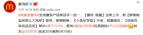 麥當(dāng)勞為宣傳新上市的薯?xiàng)l,以“就醬愛薯?xiàng)l”為話題,用戶轉(zhuǎn)發(fā)并@3位好友即可參與抽獎活動。