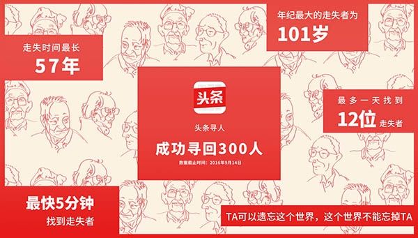 截至2017年8月30日,“頭條尋人”共彈窗推送了18237例尋人啟事,找到3000人,其中老人占比高達(dá)35%,最年長的走失者為101歲。如今,今日頭條平均彈出100個尋人窗口,就有16人能被找到。