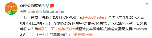 OPPO手機(jī)則是為了宣傳機(jī)器人大賽開展這個活動,要求參與用帶話題并轉(zhuǎn)發(fā)就能獲得參與抽獎的機(jī)會。