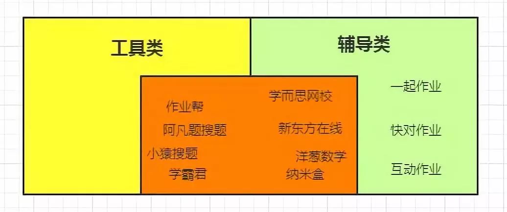 由于上面種種原因,K12領(lǐng)域的新進(jìn)挑戰(zhàn)者都明智地選擇了線上賽道,按照產(chǎn)品核心功能又可分為工具類和輔導(dǎo)類,每類我摘取了用戶量級(jí)較大的代表性產(chǎn)品,重疊處是涉及線上直播教學(xué)部分。