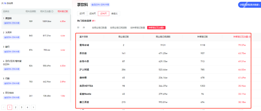 在新紅數(shù)據(jù)品類搜索-食品飲料-飲料沖調(diào)排名中熱度最高的是【茶飲料】,近3個月來的實時熱度為2211.41萬,超過95.52%的飲料沖調(diào)品類詞,其中熱門投放品牌大多都是奶茶類品牌。