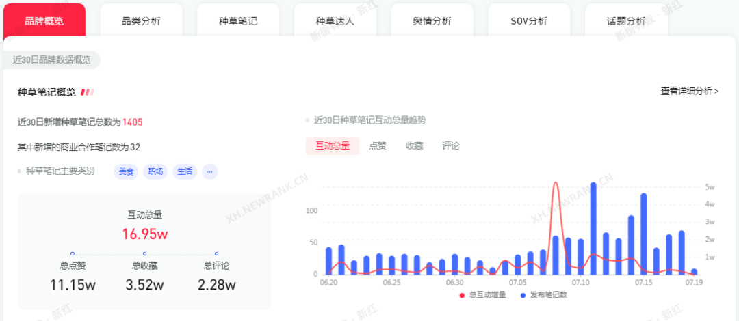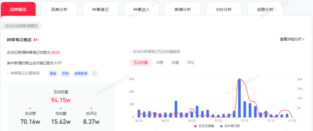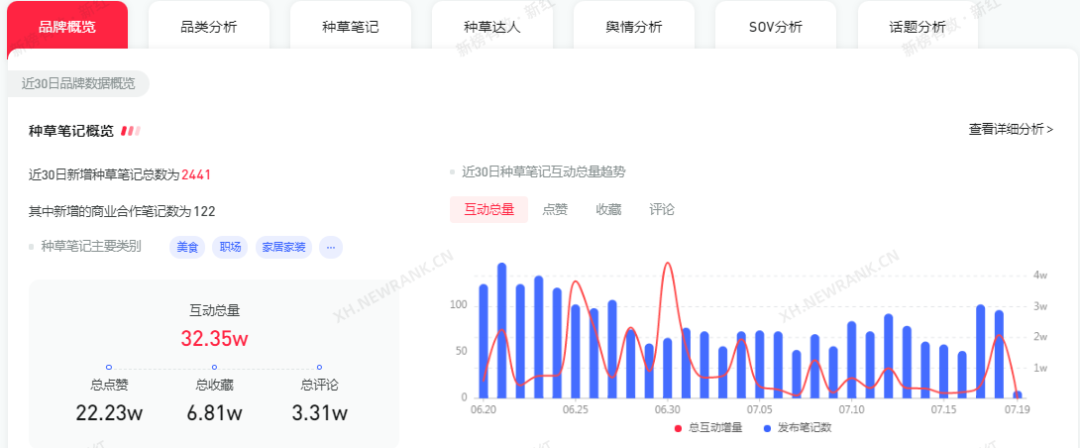 據(jù)新紅數(shù)據(jù)顯示,霸王茶姬近30天的總互動為32.35萬,6月第品牌處于鋪量階段,相較之下每天發(fā)布的種草筆記較多,但是互動量數(shù)據(jù)不太好,我們看到6月30日,互動量數(shù)據(jù)達(dá)到頂峰,當(dāng)天互動量總增量提高4.44w。近30天來霸王茶姬共發(fā)布2441篇種草筆記,總評論為3.31w,用戶評論率為8%。