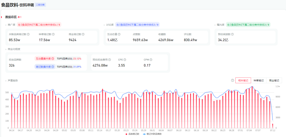如圖所示,近3個月以來,飲品類的預(yù)估閱讀量達(dá)到了34.2億,你沒有看錯,是3個月曝光34.2億。在這個不容忽視的數(shù)據(jù)背后,足以見證飲料行業(yè)在近期的火爆程度。伴隨著消費者對個性化、健康保健的迫切追求,各大品牌紛紛加大在營銷和創(chuàng)新上的投入,試圖在這個市場競爭中搶占先機。