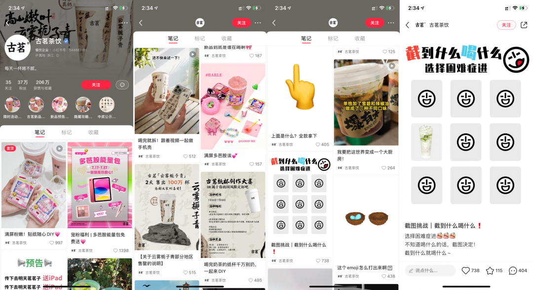 古茗在小紅書上的差異化營銷主要表現(xiàn)在兩個方面。首先,它的品牌定位是高品質(zhì)茶飲,通過精選高品質(zhì)原料、獨特的制作工藝等方式來打造高品質(zhì)的茶飲。通過精美的圖片、有趣的文字、短視頻等多種形式來呈現(xiàn)這些內(nèi)容,并將品牌理念和產(chǎn)品特點融入其中。此外,古茗還與一些KOL、博主合作,通過他們的推廣和評測來增加品牌曝光度和用戶購買欲望。多樣化的內(nèi)容策略不僅能夠吸引用戶的注意和關(guān)注,還能夠提高用戶對品牌的認(rèn)知度和好感度。茶飲制作教程是最受用戶歡迎的筆記類型之一,通過圖文并茂的方式展示茶飲制作的具體步驟和技巧,吸引用戶的學(xué)習(xí)和嘗試。知識科普和品牌故事則能夠提高用戶對品牌的認(rèn)知度和好感度。這種多樣化的筆記類型能夠吸引不同類型的用戶參與和互動。
