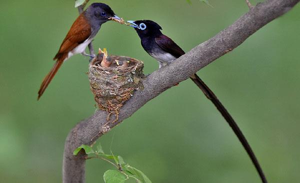 繁殖期間領(lǐng)域性甚強(qiáng),一旦有別的鳥侵入,立刻驅(qū)趕,直到趕走為止。繁殖期5-7月,營巢由雌雄鳥共同承擔(dān),每個(gè)巢5-6天即可完成,巢呈倒圓錐形,結(jié)構(gòu)相當(dāng)精致,距地高1-3m。每窩產(chǎn)卵2-5枚,多為3-4枚。卵為橢圓形或梨形,卵的顏色變化較大,有的為乳白色或白色、被有細(xì)小的紅褐色、赤白色或青灰色斑點(diǎn)。孵卵主要由雌鳥承擔(dān),雄鳥在雌鳥離巢期向亦參與孵卵活動(dòng),孵化期15±1天。雛鳥晚成性,雌雄親鳥共同育雛,經(jīng)過11-12天的喂養(yǎng),幼鳥即可離巢。