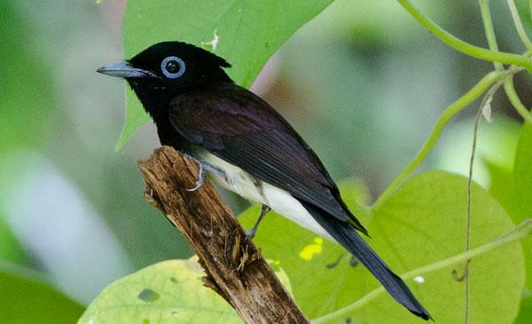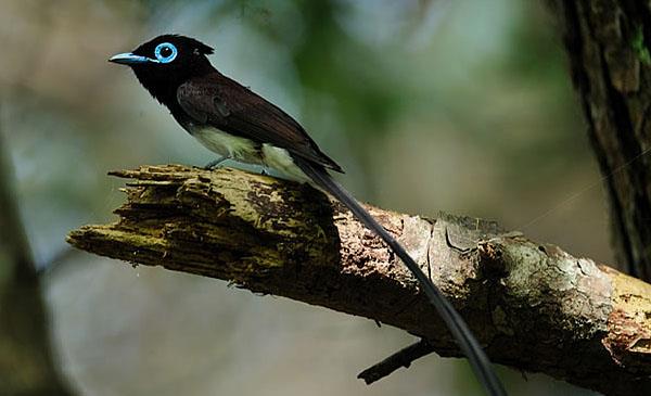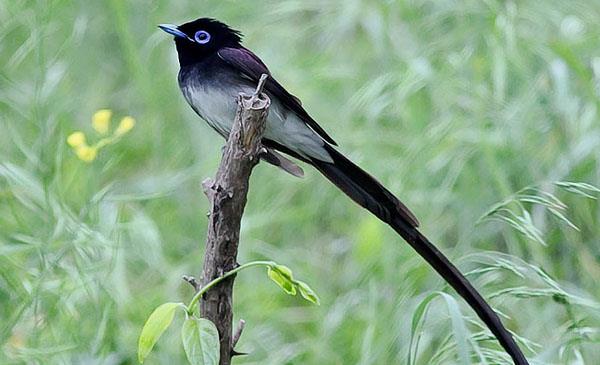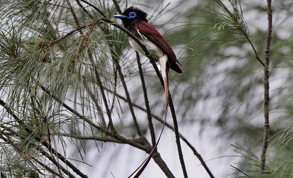 頭體長19-21cm,雄鳥計(jì)尾長40cm左右,重19-25g。喙基較寬闊,嘴強(qiáng)健,上喙先端稍下彎并具銳鉤,有較發(fā)達(dá)的口須。翅尖,尾叉形。腿、腳強(qiáng)健,爪鉤狀。成年雄鳥胸部的羽毛呈黑灰色,有紫藍(lán)色的光澤,具冠羽。下身則是白色。翼、背部及臀部呈黑栗色。尾巴中央有極長的黑色尾羽,雄雛鳥的此尾羽則較短。虹膜深褐,眼周裸露皮膚藍(lán)色,嘴藍(lán)色,腳偏藍(lán)??砂l(fā)出笛聲及甚響亮的chee-tew聯(lián)絡(luò)叫聲,似黑枕王鹟叫聲,但較強(qiáng)烈。